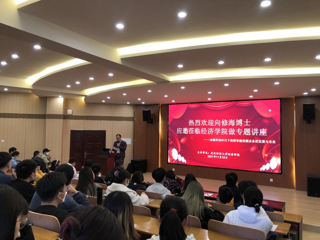 11月18日下午,华中科技大学数量经济学博士、中国金融期货交易所和复旦大学联合培养博士后、优品科技有限公司首席策略管向修海博士应邀来beat365英国官方网站以《金融科技时代下我国智能投顾业务的发展与未来》为题开展讲座,beat365英国官方网站院长段丁强教授、副院长倪武帆教授、研究生导师代表以及全体研究生和部分本科生参加了本次讲座,讲座由beat365英国官方网站院长段丁强教授主持。