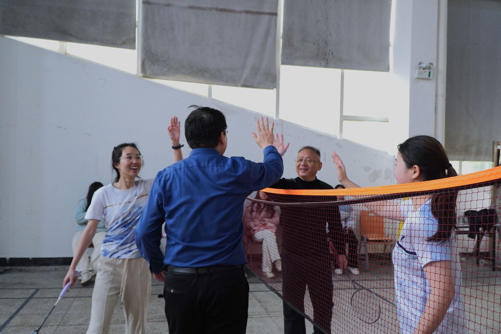 趣味羽毛球比赛按照接力赛、混合团体赛、团体表演赛三个环节逐次进行。首场竞技是以接球数量决定胜负的接力赛。双方队员在场上你争我夺,各团队成员间的紧密配合充分展现了集体主义精神。紧接着是混合团队赛,罗锦银与同学们并肩作战,共同参与双打比赛,迎接激烈的较量。羽毛球在空中飞舞,划出一道道优美的弧线。比赛过程中,罗锦银不时地给予同学们鼓励和指导,分享打球技巧和经验,让同学们在紧张的比赛氛围中感受到关怀。这一互动不仅加深了师生间的交流,也传递了浓厚的温情。在团体表演赛中,各小组纷纷派出优秀的羽毛球选手进行激烈双打对决,精彩的发球、巧妙的接球引发了现场的阵阵欢呼,将整场比赛推向高潮。