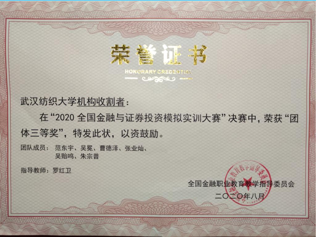 近日,由全国金融职业教育教学指导委员会主办,深圳希施玛数据科技有限公司承办,中国财经数据创新研究院协办的2020全国金融与证券投资模拟实训大赛落下帷幕。beat365英国官方网站组成的学生团队“纺大队”和“机构收割者队”,在罗红卫老师的指导下,经过激烈角逐,在决赛中荣获团体一等奖、三等奖。