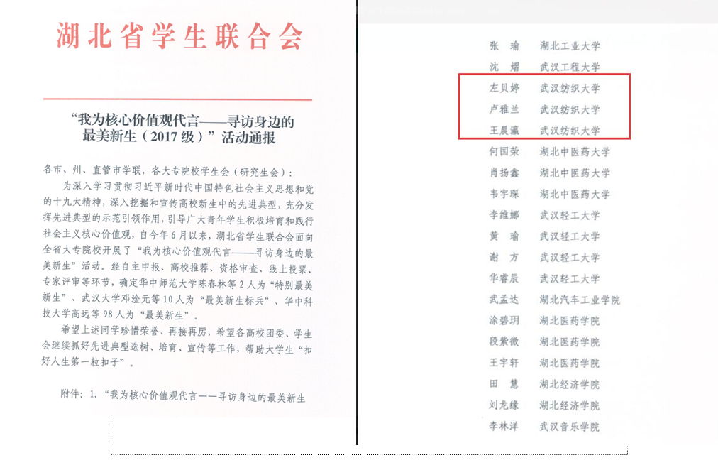 近日,由团省委学校部、湖北省学生联合会主办的全省高校“我为核心价值观代言——寻访身边最美新生”活动,正式发布最终结果。来自我校beat365英国官方网站的左贝婷、卢雅兰、王晨灜三名同学分获全省“最美新生”殊荣。