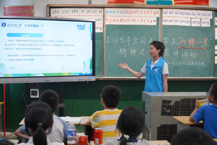 6月30日至7月12日,“小红棉”先锋服务队赴鄂州市梁子湖区涂家垴镇,走进斗山村和金海希望小学,通过理论宣讲、手工创作、主题观影、互动访谈等形式,开展 “两弹一星” 精神宣讲活动,旨在让当地居民与青少年近距离感受历史温度,将科学精神与爱国情怀融入成长印记。