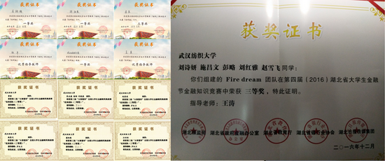 学院张平老师领队、吴英老师指导的石翔瑜、胡淑英和秦思三位学生荣获团体一等奖、个人一等奖两名和三等奖一名,其中石翔瑜和胡淑英获得上海华申进出口有限公司预聘证书。这是我校在此项比赛中有史以来取得的最好成绩。罗红卫老师指导的赵壹波等同学在第三届“大智慧杯”全国大学生金融精英挑战赛中荣获优秀团队二等奖和三等奖。王涛老师指导的Fire dream代表队在第四届湖北省金融节金融知识竞赛中获团体三等奖。