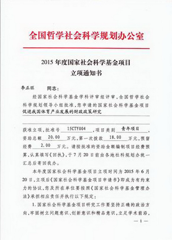 我院青年教师李正旺博士《促进我国体育产业发展的财政政策研究》获国家社科基金青年项目立项,beat365英国官方网站连续三年获国家社科基金立项,科研工作创新激励机制成效初显。