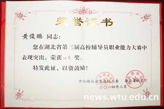 近日,由省委高校工委、省教育厅主办的湖北省第三届高校辅导员职业能力大赛在华中师范大学圆满落幕。经过笔试、个人PPT简介以及主题班会VCR等环节的激烈角逐,我院辅导员黄俊鹏老师从全省高校156名优秀专职辅导员中脱颖而出,喜获优秀奖。