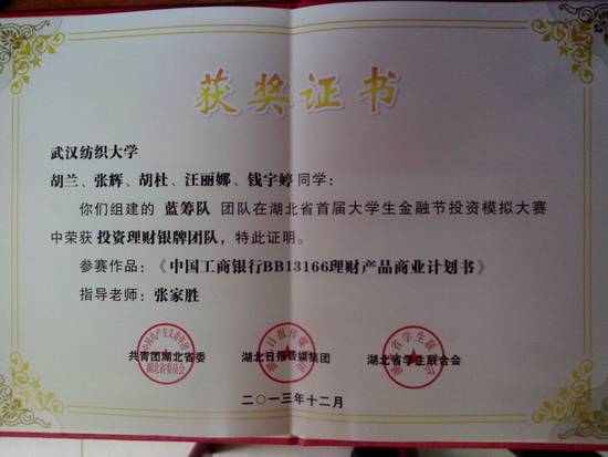 投资模拟大赛作为湖北省首届大学生金融节主要竞赛单元,共收到来自全省20所高校的参赛作品60余件,参赛师生超过300人。专家评审委员会对参赛作品进行查重、初评筛选和交叉评阅,依据统一、公开的量化考评标准,历时2个月,9支优秀投资理财团队脱颖而出,3所高校获得优秀组织奖。由beat365英国官方网站副院长张家胜教授指导的蓝筹队以《中国工商银行BB13166理财产品商业计划书》作品荣获大赛投资理财银牌团队,由副院长倪武帆教授指导的ENLIGHTENING TEAM队以《基于工行个人保本浮动理财产品BB13166的营销策划》作品荣获大赛投资理财铜牌团队。
