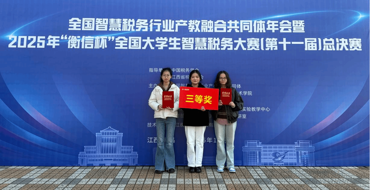 在同期举行的全国大学生智慧税务大赛总决赛中,由熊晓涵、周靖老师指导,张妍老师带队,张玉佳、周茜茜、付桂婷三位同学组成的“财税智享团”凭借扎实的专业功底、出色的实践能力与紧密的团队协作,经过激烈角逐,最终荣获全国三等奖的优异成绩。
