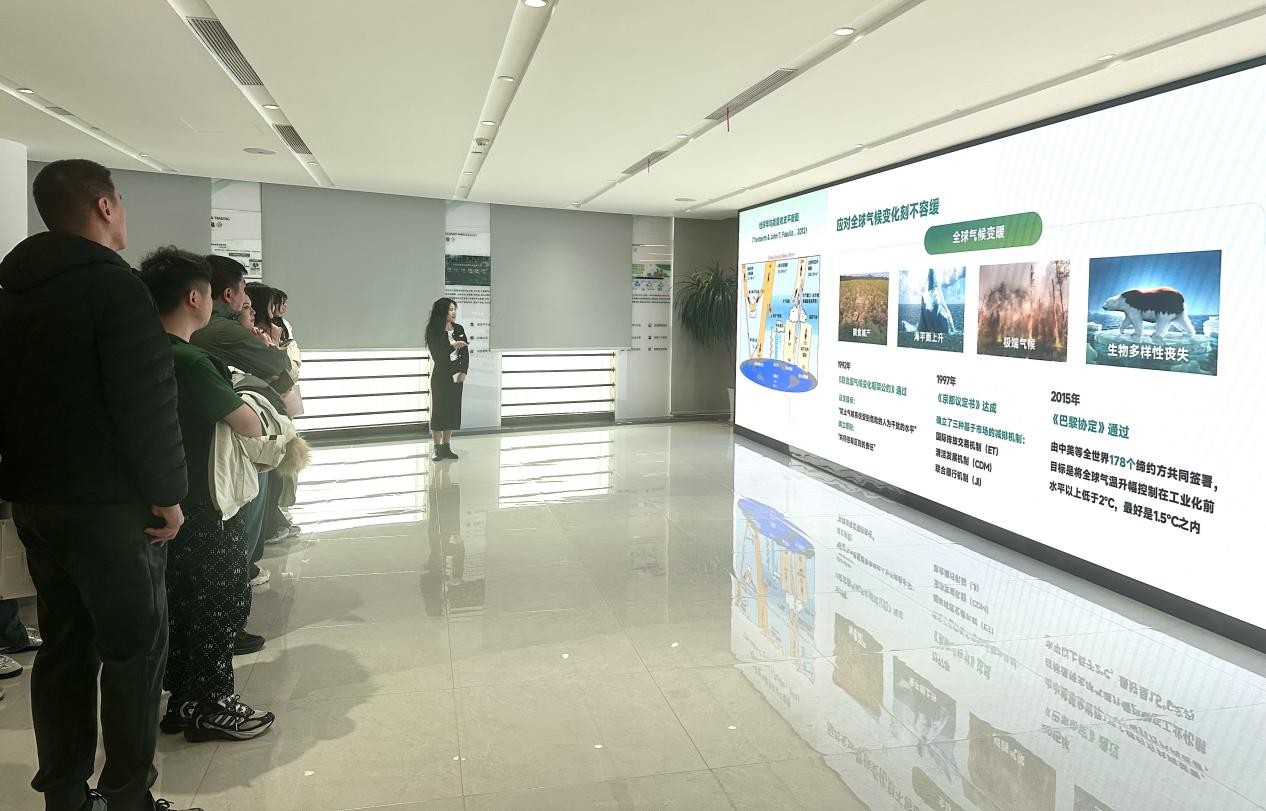 座谈会后,师生一行前往中碳登公司,聆听气候投融资部负责人张启星关于全国碳市场体系的全景解读。张启星指出,经过多年探索,全国碳市场已形成 “全国统一市场 + 地方试点支撑 + 碳普惠补充” 的多层次、立体化架构 —— 专业注册登记与交易机构的设立筑牢了市场运行基石,以湖北为代表的 8 个地方试点提供了丰富的机制创新经验,30 多个省市的地方碳普惠机制则激活了社会公众的低碳参与热情,三者协同发力,推动我国碳市场建设稳步迈向高质量发展阶段。