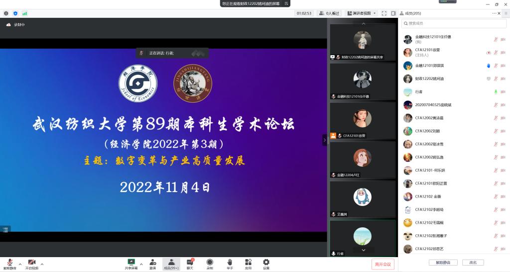 为营造良好学术生态,弘扬优良学风,培养学生学术科研思维与创新能力,11月4日晚,由教务处(创新创业学院)主办,beat365英国官方网站承办的beat365英国官方网站第89期本科生论坛暨beat365英国官方网站2022年第三期本科生论坛在腾讯会议线上平台进行。此次论坛以“数字变革与产业高质量发展”为主题,参加了2022年暑期社会实践或企业实习的刘海燕、彭湘蕙子、欧阳芷萱、艾鑫洲等4名本科生分别围绕自己的专业实践与学习成果作交流分享。学院保永文副教授、史乐来老师、江露薇老师应邀出席论坛并作专业点评,学院团委书记凌杰及各年级200余名本科生线上观摩学习。