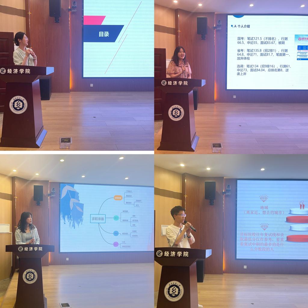 活动中,6位19级学生分享有关成功上岸、收到offer和考取选调生的宝贵经验。国内考研学生代表从考研目标选取、备考时间安排、复习方法建议、复试技巧等多个方面,针对“考公还是考研?”“是否可以冲刺名校?”等问题表达了自己的观点。国外考研学生代表带领同学们分析出国留学的优势和劣势,比较各个国家的申请条件,并分享申请国外大学的切身体会。考公学生代表结合亲身经历,围绕国考、省考和选调生的报考注意事项,为同学们带来考公方面的详细解说。拿到数十份offer的就业达人代表深刻剖析券商、银行的投递简历要点,带来有关笔试、面试的技巧总结分享。听完学生代表们的分享,在场同学纷纷表示“干货满满”。