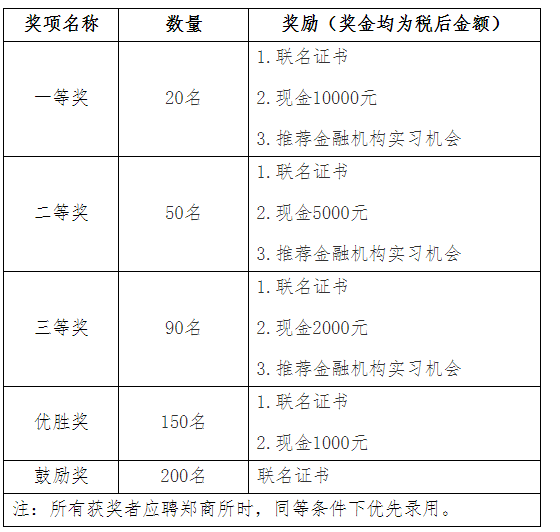 一等奖、二等奖、三等奖的获奖者可获得:(1)郑商所、金融教指委、中期协联合颁发的证书;(2)现金奖励;(3)推荐郑商所、中期协以及其他金融机构实习机会。其中,一等奖奖励税后10000元,二等奖奖励税后5000元,三等奖奖励税后2000元。