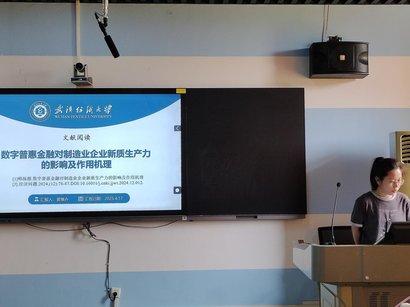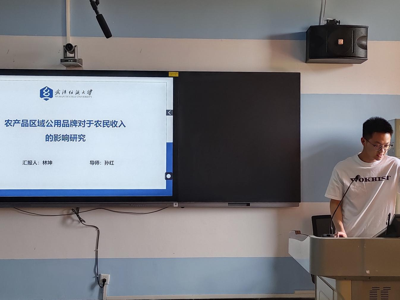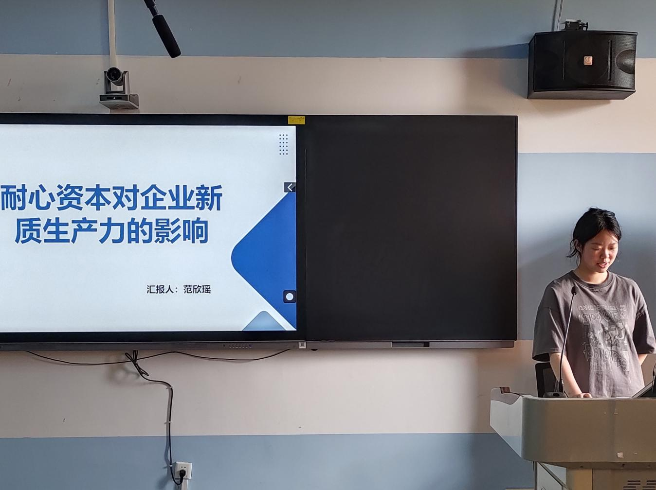论坛上,六位主讲人依次登台,分别围绕近期学术研究成果进行汇报。林坤同学以《农产品区域公用品牌对于农民收入的影响研究》为题,深入探究了农产品区域公用品牌提升农民收入的作用路径,并规划后续的研究计划。范欣瑶同学以《耐心资本对企业新质生产力的影响》为题,通过理论分析与实证研究,揭示耐心资本驱动企业新质生产力提升的内在机制与实际效应。黄唯卉同学以《数字普惠金融对制造业企业新质生产力的影响》为题,深入探讨了数字普惠金融如何推动制造业企业新质生产力的提升,为产业升级与经济高质量发展提供了新的思路与理论支持。张浩然同学以《新质生产力背景下数实融合的深度与广度测算》为题,通过梳理相关理论,结合实际案例,运用合适的方法对新质生产力背景下数实融合的深度与广度进行测算和分析。丁文龙同学以《数字金融与企业金融化》为题,通过数据收集与分析,探讨数字金融发展对企业金融化趋势的影响与内在关联。姚梦瑶同学以《高等教育与经济高质量发展:机制、路径与贡献》为题,运用实证分析方法,系统探究了高等教育驱动经济高质量发展的内在机制、可行路径及实际贡献度。