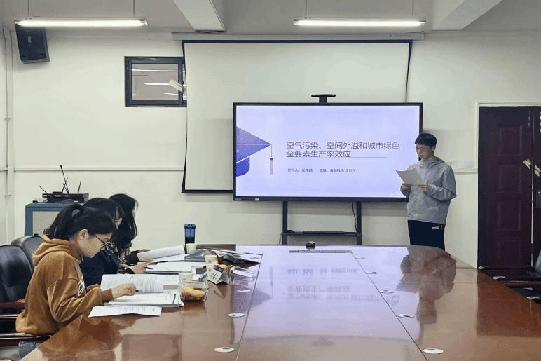 本次学术论坛以“能源经济与绿色金融”为主题,吴伟航、毛慧丽、罗巧、吴子杨四位主讲人围绕该主题,分别从“空气污染对绿色全要素生产率的影响”“产业智能化能否降低碳排放”“国家发电补贴政策与能源转型”“武汉市新能源充电桩数字化发展”四个课题汇报了本团队的研究成果,条理清晰地向评委老师展示了本团队的研究思路及方法,并就各自的观点进行了交流讨论。