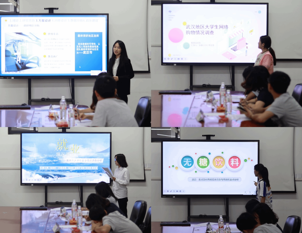 在答辩会上,17个课题团队围绕“大学生就业创业”,“网络购物”,“新农业电商发展”,“无糖饮料的市场现状”等多个方面,多思路、多视角汇报了本团队的目前调研构想。李仪菲从社会调研数据出发,分析得出大学生的网络购物行为及其背后的心理态度,对于引导健康消费、维护网络市场秩序具有重要意义;程佳慧介绍了其团队的调研目的,即通过本次数据调研,为高等教育机构提供策略建议,帮助他们更好地设计和实施相关教育政策和服务项目,同时也为学生个人提供参考,帮助他们做出更符合自身发展需要的选择;汪丽蕊着重分析了无糖饮料市场现状与市场机会点,通过问卷调查、市场观察、趋势分析、产品测试等多种调研方法,探讨了无糖饮料的市场容量、竞争格局、发展趋势,为企业产品开发,市场营销等方面提出了宝贵建议。答辩现场气氛热烈,同学们积极展示研究成果,交流分享社会实践构想。