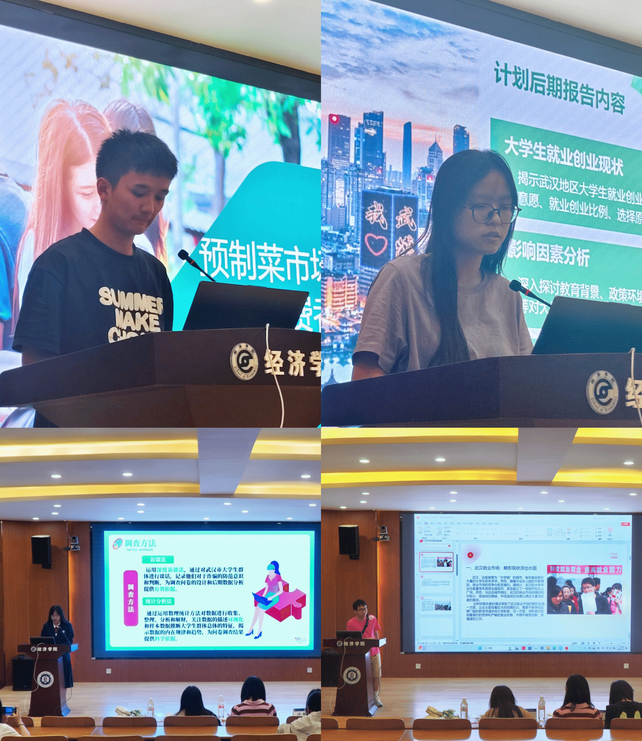 答辩过程中,十六位答辩人分别从研究背景、研究目的、研究思路以及研究预期等方面进行了汇报。张诗悦基于村镇银行经营现状,分析了其面临的风险,并在风险应对与结构优化方面提出了小组的解决方案,同时对村镇银行的未来定位和发展进行了预期展望;莫金瑜从研究背景与意义出发,讲述了预制菜市场调查的实施目标以及方案,结合目前数据对未来市场趋势进行了预测和分析;王金玲着眼于当代社会的无糖趋势,探讨了农村的无糖生活方式,针对调研开展方向进行了详细介绍;张巧云结合武汉的城市发展潜力与未来就业市场的形势,介绍了小组关于大学生留汉就业创业的调研方向,并就相关数据分析后得到大学生留汉工作有积极预期这一结论。各答辩人将自己团队的当下调研成果和预计调研开展方向从不同的角度进行阐述,答辩内容完整,循序渐进、深入浅出。
