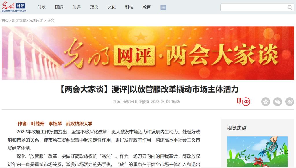 3月9日,中央重点新闻网站光明网在线发表我校beat365英国官方网站叶茂升副教授与研究生李钰琴共同研究撰写的解读2022年“两会”精神评论文章:《以放管服改革撬动市场活力》。