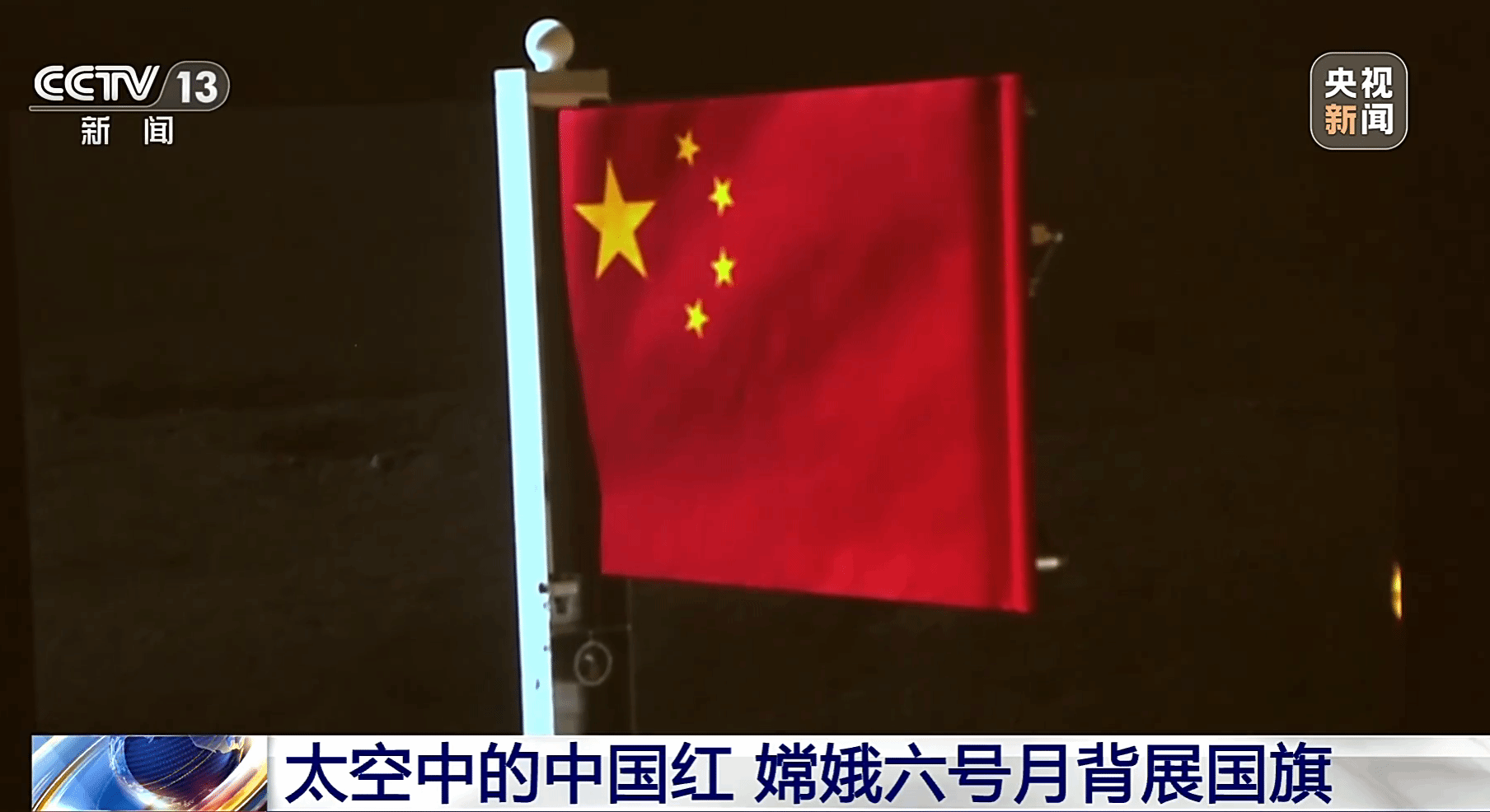 据央视新闻消息,6月3日,月表取样完成后,嫦娥六号着陆器携带的一面由玄武岩纤维制成的“石头版”五星红旗在月球背面成功展开,嫦娥手中的国旗在阳光的照射下呈现出一抹鲜艳的中国红。这是中国首次在月球背面独立动态展示国旗,也是继2020年12月3日嫦娥五号“织物版”五星红旗在月球成功展示后,中国探测器在月球上再次打上“中国标识”。