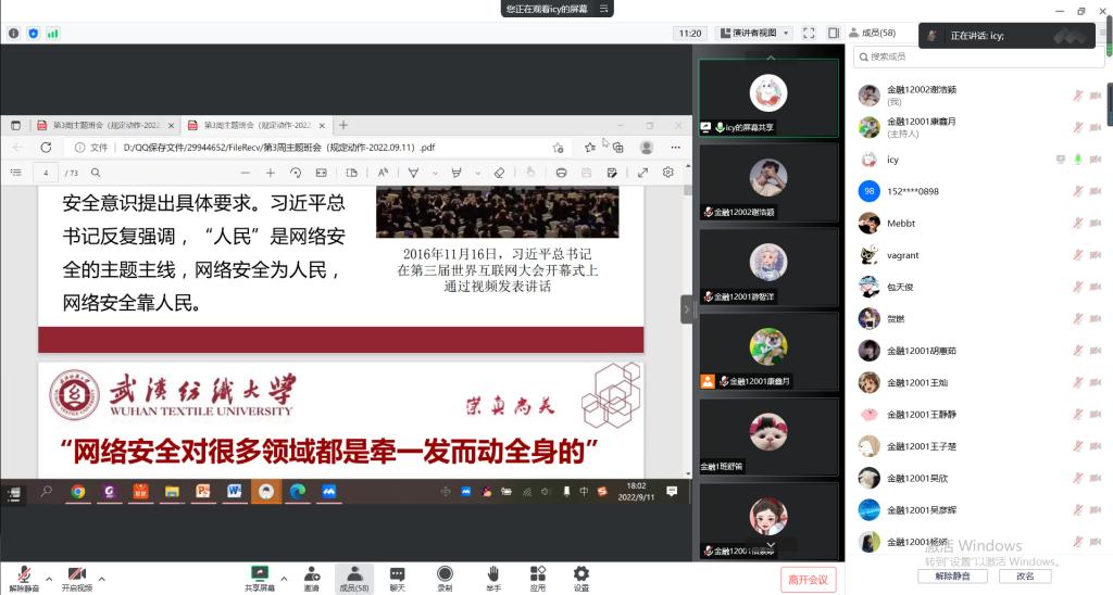 班会从学习习近平主席关于网络安全重要论述、《网络安全法》、《反电信网络诈骗法》、预防电信诈骗,共筑网络安全防线四方面展开,通过列举真实事例、引用法律法规、展示数据图表等方式让学生深刻理解网络安全及其重要性、电信诈骗的危害等内容。会上,学生积极发言,阐述自己对于网络安全的理解,并针对如何正确应对电信诈骗进行热烈讨论。