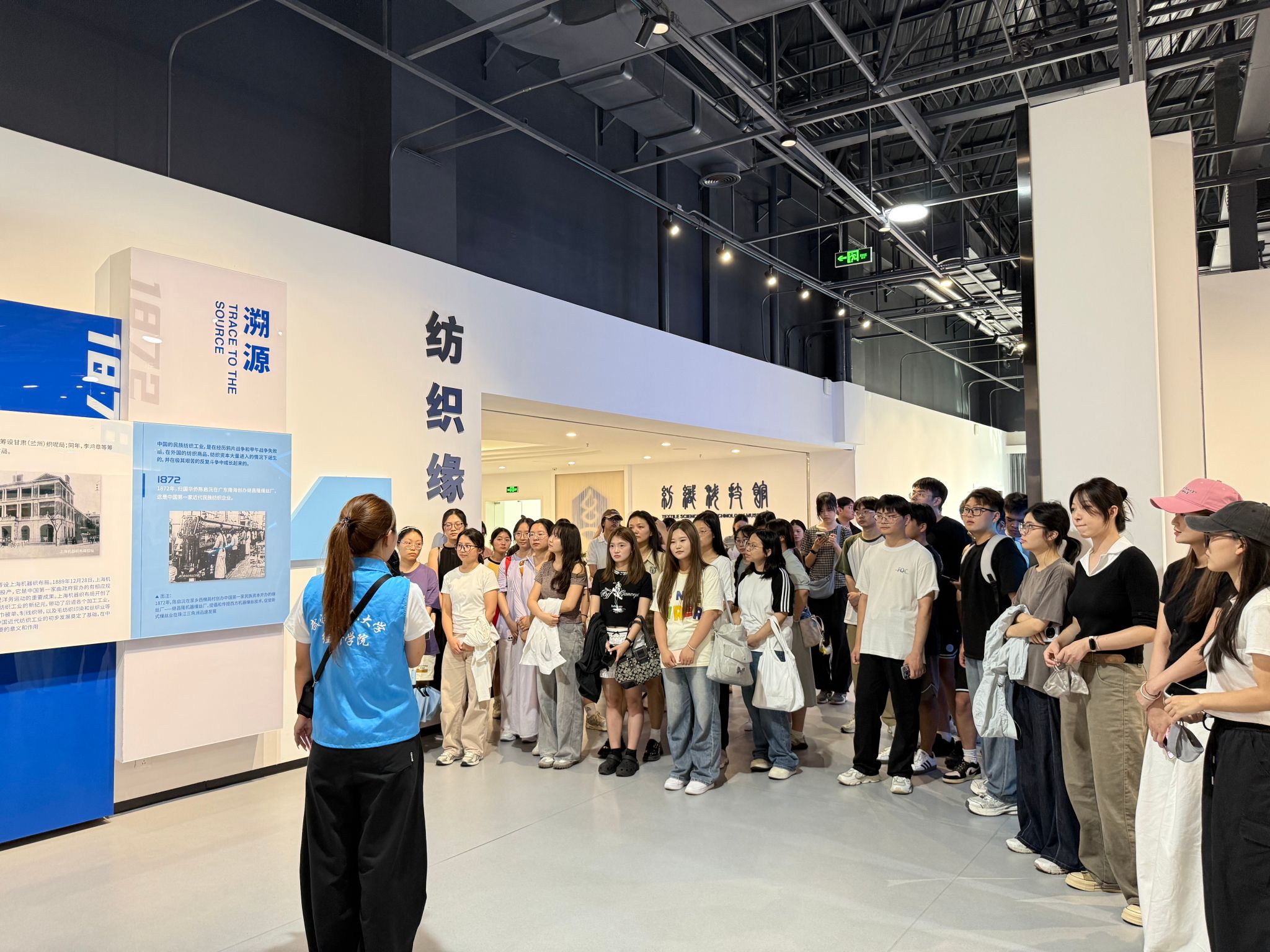 在讲解员的引导下,同学们还依次参观了纺织历史文化、现代纺织技术及未来纺织创新三大展区。从承载千年文明的传统丝绸织造技艺,到赋能智能制造的自动化纺织设备;从守护生命健康的医用防护纺织品,到助力“双碳”目标的生态环保纤维,丰富的展品、生动的图文讲解与趣味互动体验,让同学们全面了解了纺织行业从传统到现代、从民生保障到国家战略的发展历程。