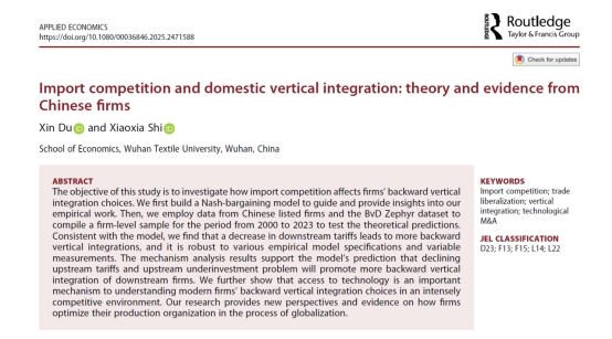 近日,beat365英国官方网站教师石小霞与研究生杜鑫在国际期刊Applied Economics(《应用经济学》)上合作发表了题为“Import competition and domestic vertical integration: theory and evidence from Chinese firms”(进口竞争与国内纵向一体化:来自中国企业的理论与经验证据)的研究成果。