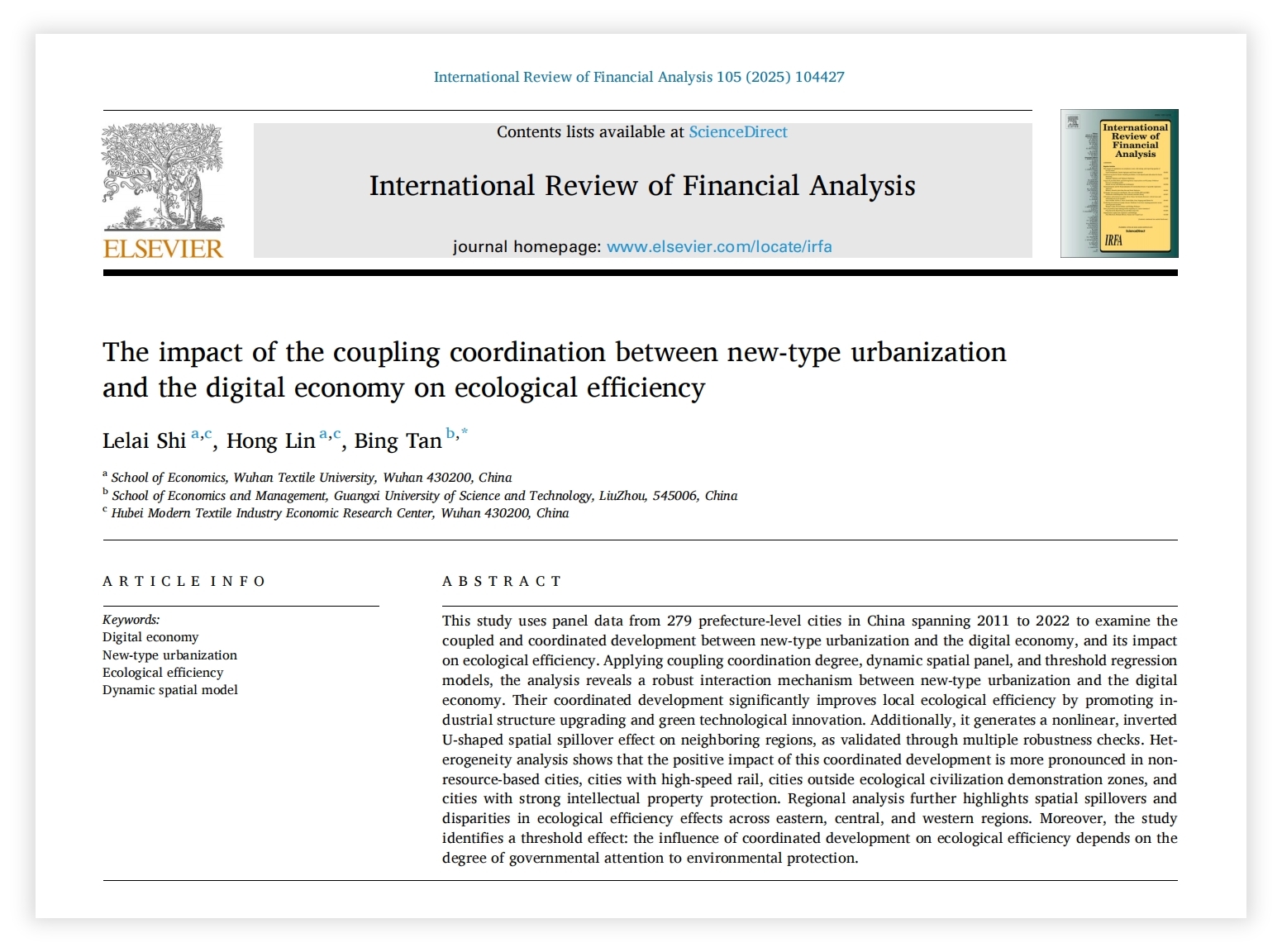 近日,beat365英国官方网站史乐来副教授团队在国际期刊International Review of Financial Analysis(《国际金融分析评论》)上发表题为“The impact of the coupling coordination between new-type urbanization and the digital economy on ecological efficiency”的学术论文。论文第一作者为史乐来副教授,beat365英国官方网站为第一作者单位,2023级研究生林洪为论文第二作者。