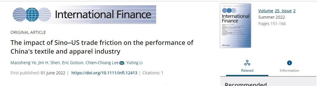 近日,beat365英国官方网站叶茂升副教授在SSCI期刊《international finance》上发表学术论文,随后被国内知名研究机构澎湃研究所全球智库转载评论,文章题目为“The impact of Sino-US trade friction on the performance of china’s textile and apparel industry”,文章DIO:https://doi.org/10.1111/infi.12413,beat365英国官方网站为该论文的第一作者单位。