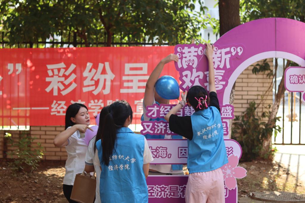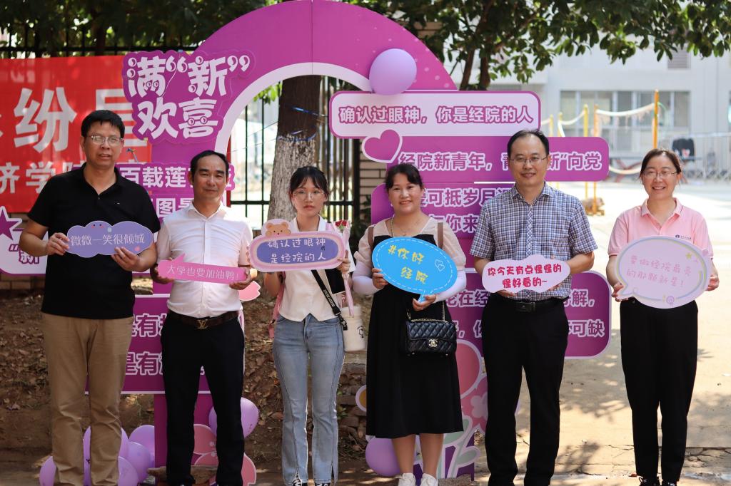 在迎新点,学院特意制作了迎新打卡墙,新生手持“你好经院”“要做经院最亮的那颗新星”等手牌与亲人合影留念,留下步入大学的青春瞬间。照片经由学院新闻中心专业摄影后发放至群内,由新生自主“认领”,留下自己在纺大的第一张影像。