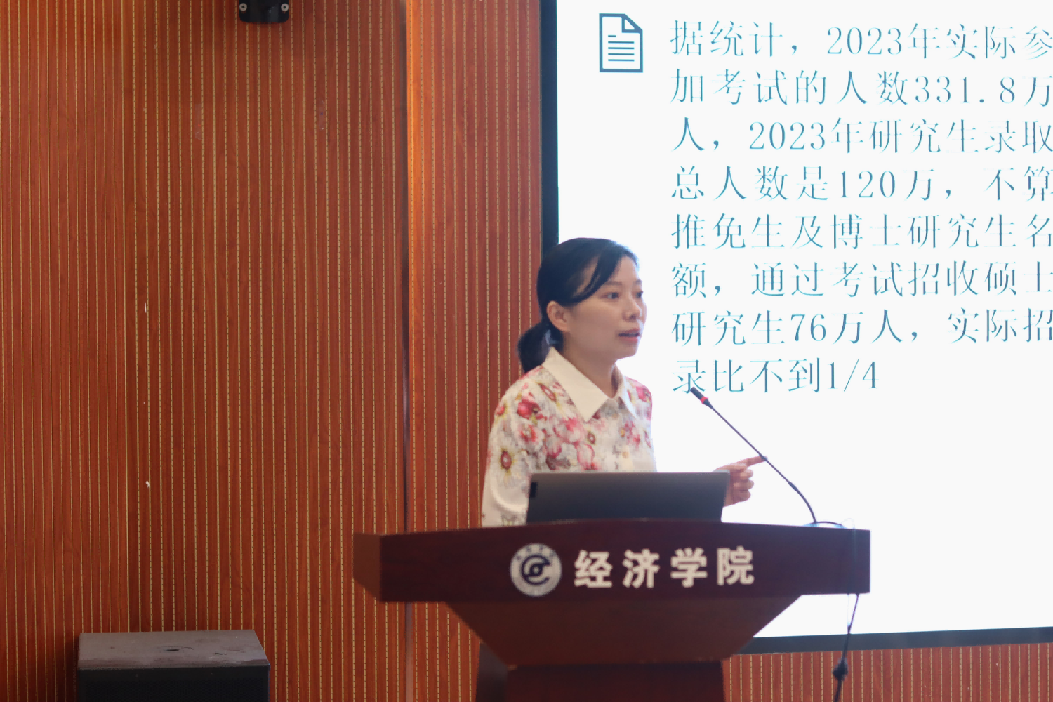 会上,郭雪围绕研究生备考相关问题展开,她提到要建立“考研认知”,让自己的分数实现最优价值。通过列举历年取得的成果,她全方位、多层次地介绍了学院研究生人才培养的特色及相关流程,分别从招生准则、专业细分、培养方式等内容作了具体讲解。