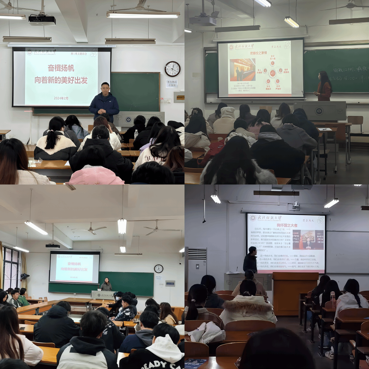 会上,老师带领同学们一起了解过去一年国家、省市及学校的重大时事、重要政策和重大成就,做好爱国荣校教育。在欢迎同学们返回校园、开启美好新学期的同时,老师们还提醒大家增强个人安全意识,遵守宿舍管理规定、增强消防安全、网络安全意识。各班还分别学习了“开学防诈”“防范电信网络诈骗”和期末学习情况分析,进一步提高同学们的风险防范意识,提醒同学们认真完成学分自查和替换。全体班主任请各位学生分享寒假社会实践见闻,畅谈新学期学业就业创业规划,并根据每位学生的答案提出建议和指导,引导学生顺应时代、学新思想、成长为新时代的好青年。