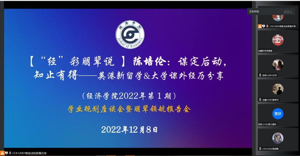 为发挥学生朋辈群体的先锋引领作用,营造良好院风、学风,12月8日下午,学院第一期“‘经’彩朋辈说”报告会通过线上腾讯会议平台进行。本次报告会特邀学院CFA11901班学生、喵了个喵武汉科技有限公司法人陈培伦主讲,学院各年级200余名本科生参加报告会。