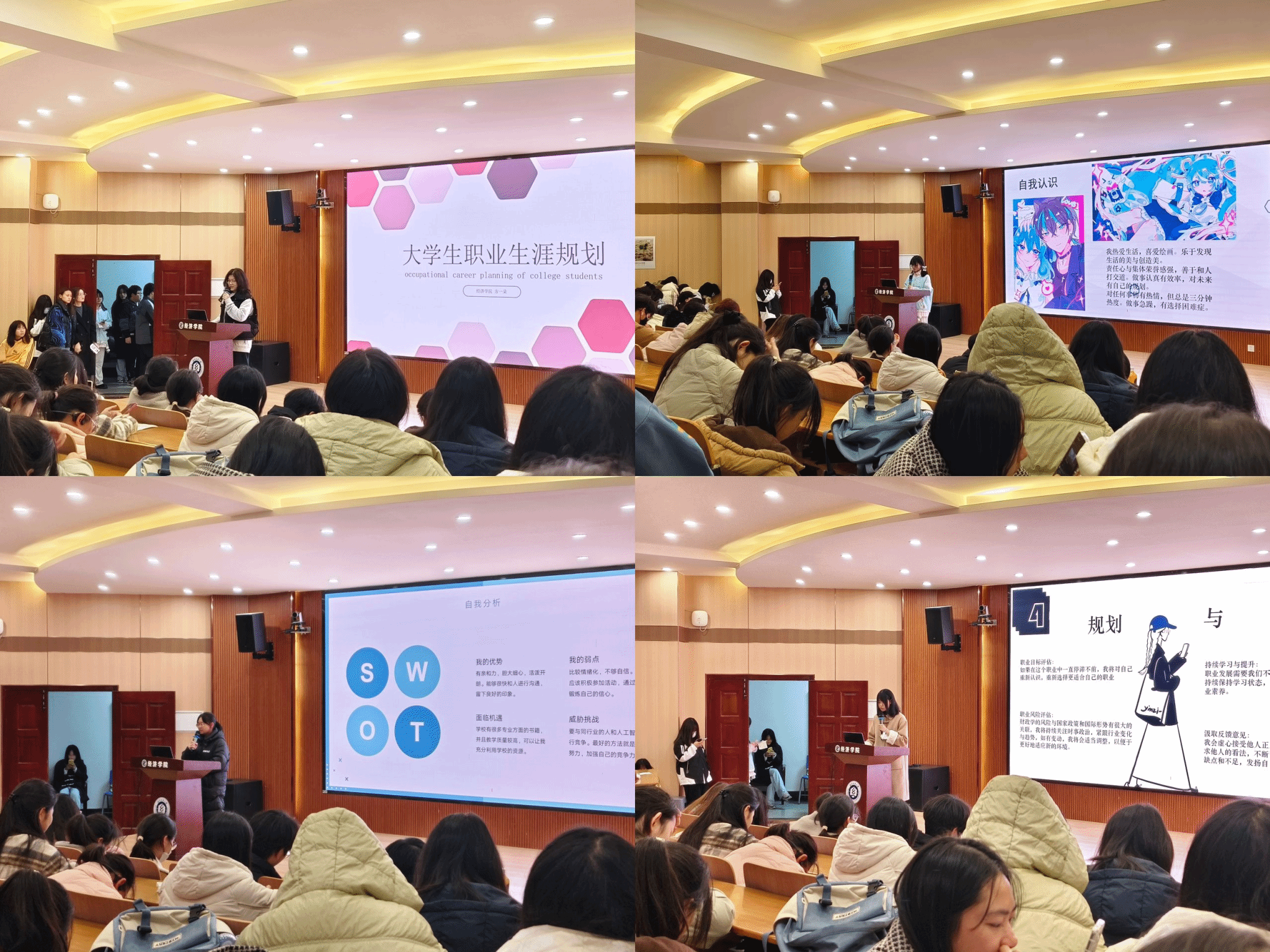 为响应学校有关加强学生职业规划教育的指示,学院于12月10日在崇德楼T301报告厅开展大一年级职业生涯规划大赛优秀作品展示活动。方一朵、彭心芷、熊可果、张耀匀四位同学受邀展示。国贸12302方一朵从自我分析、市场分析和路径规划三个方面展开展示。她认为,大学生需要明确目标,找到适合自身的职业并为之努力。辅导员汪伦表示,大一学生需要提早规划自己的职业路径并付诸行动,并强调了职业生涯规划的重要性和时效性。现场氛围热烈而和谐,参会学生表示,将会在寒假积极参与实习和志愿活动,明确自身优势,找到未来适合的职业方向。