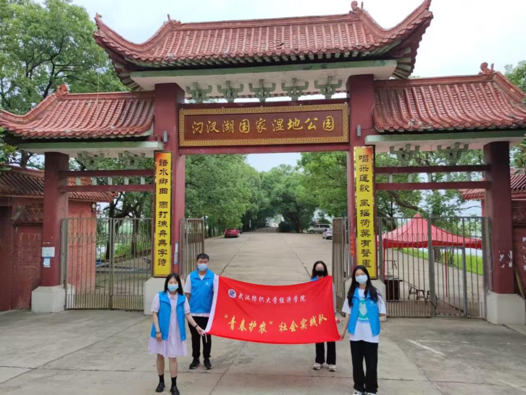 随后,实践团队来到叼汊湖国家湿地公园,考察叼汊湖特色水产养殖业与旅游业的结合情况。在湿地公园的工作人员的介绍下,我们得知,叼汊湖是“蟹肥鱼跃、菱荷争艳、岸柳成行、稻花飘香”的“汉江明珠”,是全国最大的内陆封闭型淡水湖泊。叼汊湖占地面积2489.56公顷,现有各类湿地总面积2464.51公顷,湿地率高达98.99%,设有湿地保育区、恢复重建区、宣教展示区、合理利用区及管理服务区五个功能区。汈汊湖湿地公园是在全面恢复汈汊湖洪泛型湖泊湿地基本水文条件的基础上,结合江汉平原自然地理条件,依据生态学原理,通过一系列工程及生物措施,逐步恢复并保护汈汊湖野生动植物的自然生境,保护湿地动植物资源;同时,合理利用湿地生物及生态资源,开展一系列与湿地相关的文化保护、科普宣教和生态旅游活动,将汈汊湖湿地公园建设成长江中下游区域浅水型湖泊湿地保护与利用的典范。