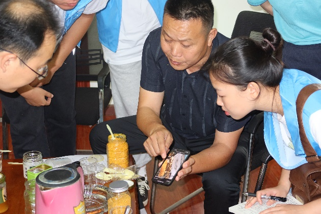 “我们的产品已经卖到国外去了!他们都是通过网站找到我们的!”实践第一站,是位于黄陂区蔡榨街周梅家田村的亿丰蜂业,创始人阮爱功热情接待了队员们。当年,响应政府号召,阮爱功毅然回乡创业,注册公司、组建了蜂农合作社。从最初的线上线下合并经营,到现在全部转入线上销售,阮爱功组建的蜂农合作社已有156名社员,遍布全国各地。由其提供设备、技术,周边村湾两百多户蜂农加盟,产品销往韩国、新加坡等东南亚国家及地区,年销售量可达四千万,带领百余户蜂农走向致富路。