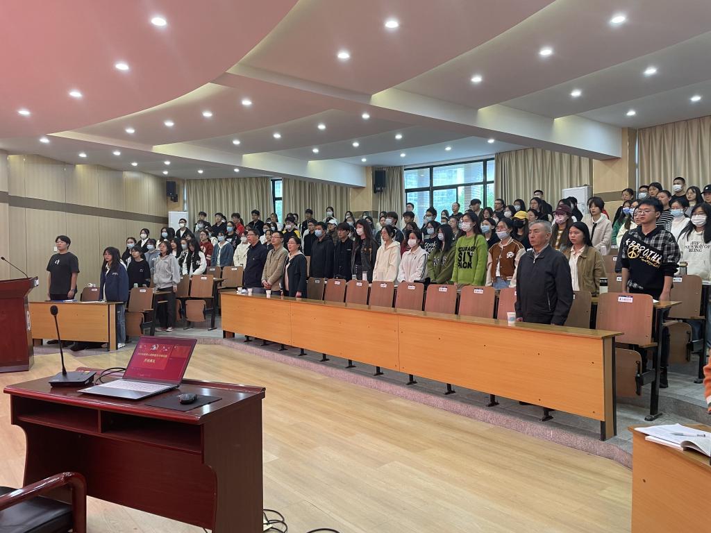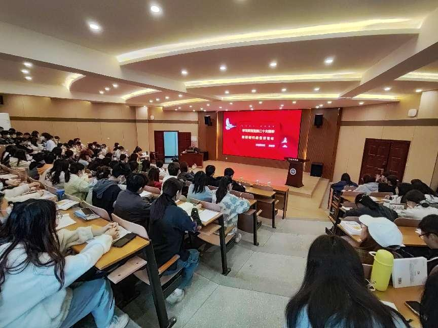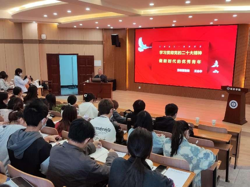 王金华教授做了《学习贯彻党的二十大精神,做新时代的优秀青年》的主题报告。王教授围绕“中国共产党第二十次全国代表大会召开盛况”“党的二十大报告主要内容”“学习贯彻党的二十大精神做新时代的优秀青年”三个方面展开宣讲。他结合具体数据、历史和自身体会,带领同学们回顾了党的十八大以来国家各领域发展取得的重大历史成就。他指出,党的二十大是全面建成中国特色社会主义现代化强国的动员大会,为全面建设社会主义现代化国家、全面推进中华民族伟大复兴提出了新思想、新战略、新举措。
