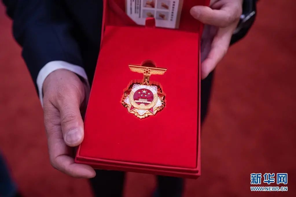 4月27日,一名代表展示他荣获的全国五一劳动奖章。