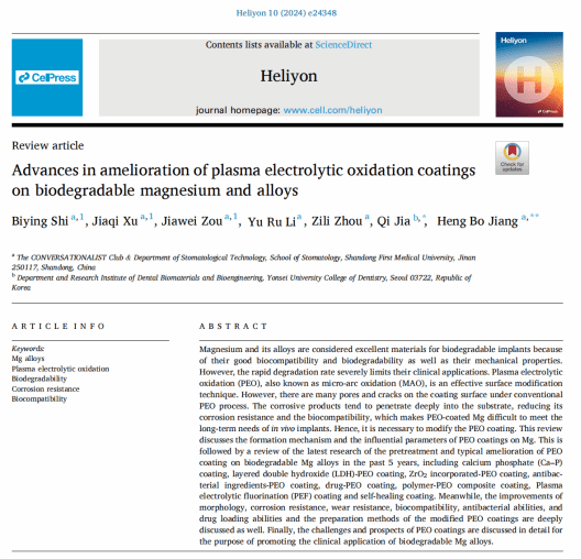近日,beat365亚洲体育官方网站“健谈者”科研社团中的2020级口腔医学专业本科生施碧颖、2021级口腔医学技术专业本科生徐佳琪、2021级口腔医学专业本科生邹家未在beat365亚洲体育官方网站姜亨波老师的指导下,以第一作者身份在综合性知名SCI期刊《Heliyon》(影响因子:4.0)上发表科研综述性论文,题目为”Advances in amelioration of plasma electrolytic oxidation coatings on biodegradable magnesium and alloys”