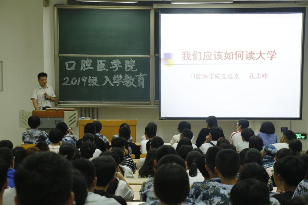 9月2日晚上,分口腔医学和口腔医学技术两个专业进行了专业教育。口腔内科学颌面外科学教研室主任赵作勤教授给口腔医学专业155名学生进行了专业教育,赵教授以病例案列为引导分享自己多年来在教学、临床工作中的心得体会,并从学习兴趣、学习方法等方面和同学们进行交流。他希望同学们珍惜时光、勤奋学习、刻苦钻研、勇于创新,发挥聪明才智,为传承和发展口腔医学事业贡献青春力量。口腔门诊部主任秦德川教授、口腔修复学正畸学教研室副主任韩晓艳、王晓慧为46名口腔医学技术专业同学做了报告,介绍了专业概况、专业课程内容、教学计划和教学大纲,以及学科建设、师资力量、教学设施等基本情况。特别是结合以后的就业去向和行业发展现状给学生的学习进行了指导,使新生对专业有了新的认识和理解,巩固了专业思想,坚定了学习信心,对自己今后的专业学习有了基本的规划。