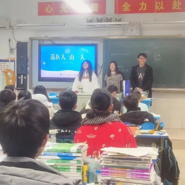 宣讲过程:三位同学就自己所想分享的内容展开了生动的宣讲。唐子淋同学介绍了山东第一医科大学的基本情况,重点突出了学校“大学+研究机构+附属医院”的创新办学模式。带领同学们重点分析2023年山东第一医科大学在山东省内各专业的招生计划、录取分数、各专业的学科限制,鼓励同学们积极报考山一大。并且分享了自己高考前的准备工作以及填报志愿时经验技巧,鼓励同学们在关键时期不要焦虑,要稳住心态坚持不懈准备高考。