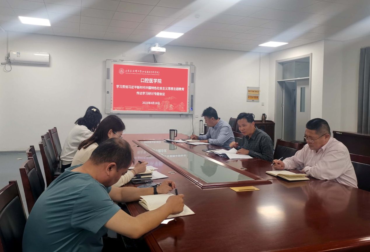 会议上孔志峰传达学习《中共中央学习贯彻习近平新时代中国特色社会主义思想主题教育工作会议精神》;中共中央关于印发《习近平新时代中国特色社会主义思想学习纲要(2023年版)》的通知和学习《习近平著作选读》第一卷、第二卷的通知;《教育部学习贯彻习近平新时代中国特色社会主义思想主题教育动员部署会会议精神》;传达学习山东省学习贯彻习近平新时代中国特色社会主义思想主题教育工作会议精神;《山东第一医科大学(山东省医学科学院)关于深入开展学习贯彻习近平新时代中国特色社会主义思想主题教育的实施方案》,研讨落实办法;学习校(院)学习贯彻习近平新时代中国特色社会主义思想主题教育工作会议精神;传达学习韩金祥同志在校(院)学习贯彻习近平新时代中国特色社会主义思想主题教育工作会议上的讲话。