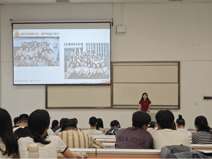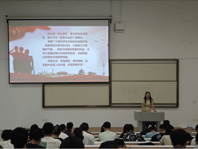 田菁同学围绕部队基本情况、参军流程、优惠政策、部队发展前途四个方面,向我们展示了丰富的军旅生活和当前军队政策。通过田菁同学的介绍,同学们更加清楚地了解了参军入伍的各项优势,激发了同学们的参军热情。